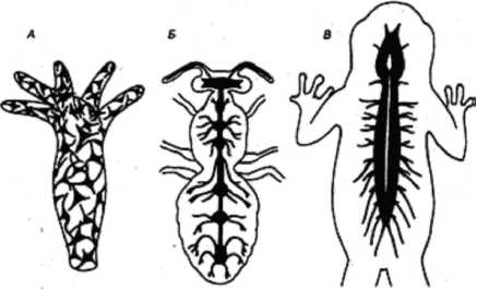 Филогенез – это эволюционное развитие. У животных нервная система формируется с появлением многоклеточных организмов, когда возникает необходимость согласованного функционирования различных клеток. Фактически именно нервная система связывает все клетки организма в единое целое. Считается, что в ходе эволюции нервная система проходит 3 основных этапа своего развития: 1) диффузная; 2) узловая; 3) трубчатая нервная система (рис. 7).