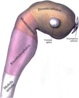 Ее задняя часть образует зачаток спинного мозга, а передний конец путем перетяжек разделяется на 3 первичных мозговых пузыря: передний, средний и задний (рис. 12).