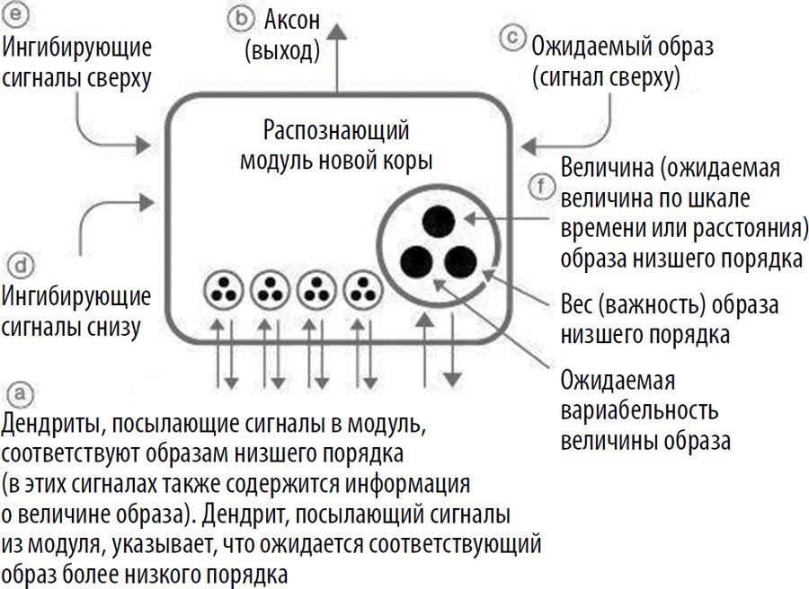 Кроме того, не забываем о том, что описанная выше иерархия является иерархией понятий. Распознающие элементы на самом деле не выстраиваются каким-либо иерархическим образом относительно друг друга; новая кора тонкая и по высоте равна лишь одному распознающему элементу. Концептуальная иерархия создается за счет взаимодействий между отдельными распознающими элементами.