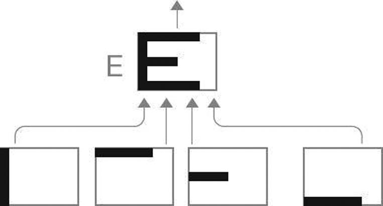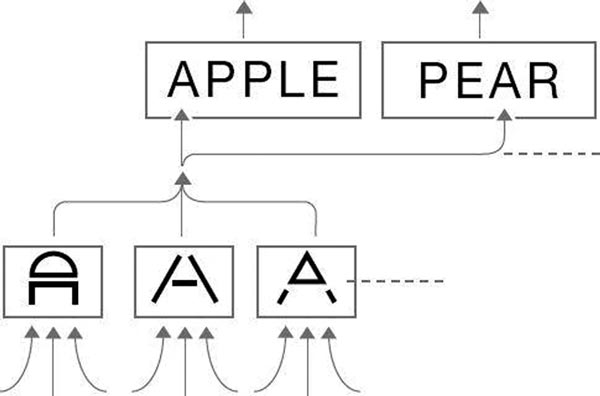 Очень важно обратить внимание на то, что поток информации не только поднимается по иерархической лестнице, но и опускается по ней. Этот нисходящий поток информации чрезвычайно важен. Например, если мы читаем слева направо и уже увидели и узнали буквы A, P, P и L, модуль, ответственный за распознавание слова apple, предскажет, что, скорее всего, в следующей позиции окажется буква E. Он отправит сигнал вниз модулю, ответственному за распознавание буквы E, и сообщит: «будь внимателен, вероятно, очень скоро возникнет образ буквы E». Модуль, распознающий букву E, скорректирует пороговые параметры в соответствии с высокой вероятностью появления буквы E. И если на месте следующей буквы возникает образ, напоминающий E, но искаженный таким образом, что «в нормальных условиях» он не был бы воспринят как E, теперь распознающий модуль узнает в нем E, поскольку таковы были его ожидания.