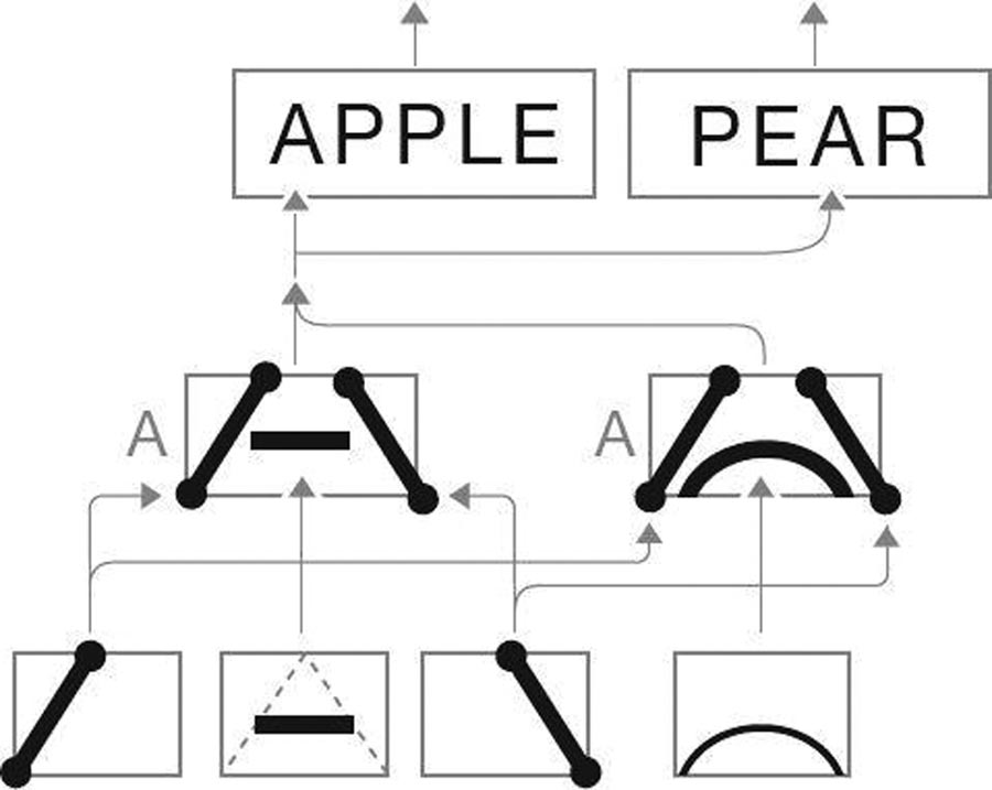 Два разных образа, составляющих букву «А» и два разных образа более высокого порядка (APPLE и PEAR), в состав которых входит «А».