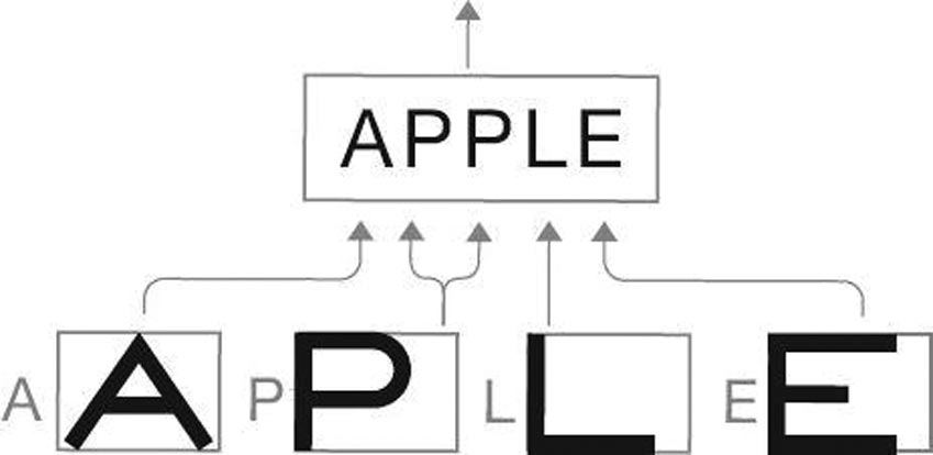 Эти образы букв соединяются в образ еще более высокого порядка, относящийся к категории слов (в нашем с вами языке – для новой коры это лишь образ определенного порядка): APPLE.