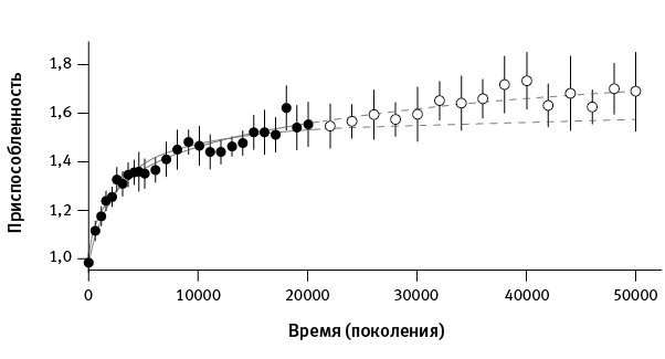 В 2013 году Ленски и его коллеги сообщили об очередном важном результате (Wiser et al., 2013). Ученые сосредоточились на росте приспособленности в подопытных популяциях. Приспособленность, напомним, оценивается как скорость размножения бактерий в стандартных условиях эксперимента по сравнению с предковым штаммом, который сохраняется в замороженном состоянии, так что его в любой момент можно разморозить и использовать в опытах.