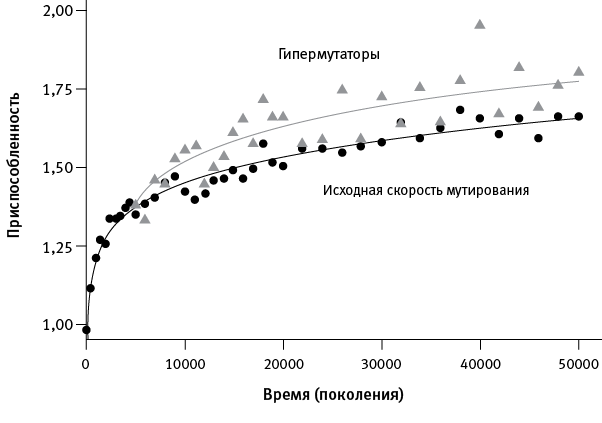 Оказалось, что у “гипермутаторов” адаптация протекала ускоренными темпами (рис. 1.2). Получается, повышенный темп мутагенеза пошел бактериям на пользу. Это противоречит распространенной идее о том, что в стабильных условиях организмам выгодно снизить темп мутирования до нуля. Ведь большинство вновь возникающих мутаций вредны, поэтому мутация, повышающая темп мутагенеза, в краткосрочной перспективе приносит больше вреда, чем пользы, и отбор, по идее, должен действовать против нее.