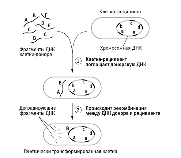 рис. 5.1. Один из способов горизонтального переноса генов у прокариот (естественная трансформация, сопряженная с гомологичной рекомбинацией), наиболее близкий по своим эволюционным последствиям к эукариотическому сексу. Бактерия поглощает фрагмент чужой ДНК из окружающей среды (это могут быть, например, фрагменты геномов погибших бактерий того же вида), а затем встраивает его в свою кольцевую хромосому вместо собственного гомологичного фрагмента. В результате аллели бактерии-реципиента уничтожаются, замещаясь чужими аллелями. В данном случае аллель B встроился в хромосому и будет передан потомкам, а аллель b погиб.
