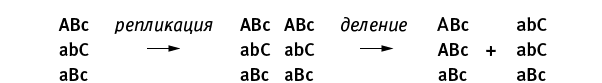 рис. 5.2. Схема жизненного цикла полиплоидной (в данном случае – триплоидной) бактерии, не имеющей митоза. Три кольцевые хромосомы, каждая из которых содержит весь геном и может отличаться от двух других отдельными мутациями, реплицируются (удваиваются) в произвольном порядке, пока число хромосом не станет равно шести. После этого клетка делится на две дочерние триплоидные клетки. Поскольку митоз отсутствует, каждой из дочерних клеток достаются три случайно выбранные хромосомы из шести (при митозе каждой дочерней клетке досталось бы ровно по одной копии каждой из трех родительских хромосом).