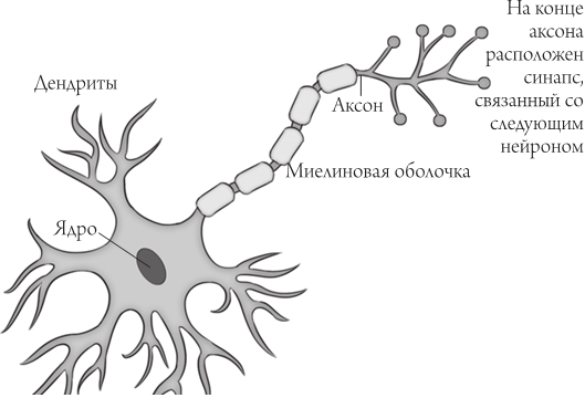 В XIX веке, исследуя анатомию нейронов, Сантьяго Рамон-и-Кахаль предположил, что сигнал идет по нейронам в одном направлении. Тело клетки и его ответвления (дендриты) принимают информацию от других клеток. Обработанные данные поступают по длинному нервному волокну нейрона (аксону) к синапсу, где сообщение передается следующему нейрону (см. рис. 1.1).