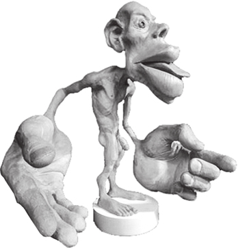 Можно сказать, что тело отражено на коре головного мозга как множество карт, в том числе как карта чувств и карта координации движений. Карты в целом повторяют строение тела, чтобы нейроны, обрабатывающие сигналы от ваших стоп, находились поближе к тем, которые заняты переработкой информации от ног, а не от носа. Но пропорции искажены: рукам и губам отведено больше тканей мозга, чем туловищу или ногам. Если нарисовать тело так, чтобы оно соответствовало этим пропорциям, получится гротескная фигура – гомункул Пенфилда (см. рис. 1.4).