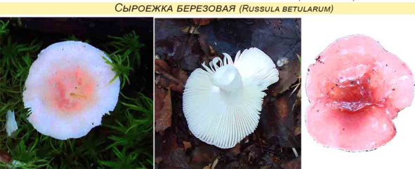 Схожесть с другими видами. Сыроежка березовая похожа на съедобную сыроежку болотную (Russula paludosa), у которой, наоборот, середина более светлая, желтоватая, а края, более темные, красноватые. Сыроежку березовую можно перепутать со жгучей рвотной (Russula emitica), у которых белая ножка и резкий перечный вкус, шляпка жгуче-красная и нет в центре другой окраски.