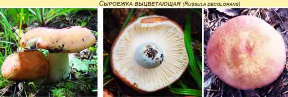 Схожесть с другими видами. Сыроежку выцветающую немного похожа на сыроежку жгуче-едкую (Russula emitica), у которой пластины белые, мякоть не сереет и имеет едкий вкус, цвет шляпки красно-бурый.