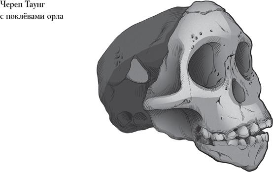 На лобной кости зияют очевидные следы ранений – резкие треугольные вмятины. Откуда они взялись? Возможны несколько версий. Во-первых, удары могли быть нанесены другими австралопитеками. Но следы слишком маленькие, их много и среди них нет сквозных. Когда предки хотели проломить кому-то голову, они делали это куда профессиональнее, это нам известно по множеству более поздних случаев. Во-вторых, отметины могут быть следами зубов леопарда или крокодила. Но тогда они были бы намного больше. Да и череп «Бэби из Таунга» совсем маленький. Леопард и крокодил скорее проглотили бы его целиком или раздробили на мелкие кусочки.