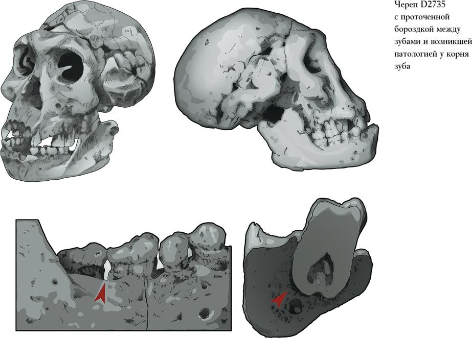 Примечательны и другие черепа из Дманиси. У молодого мужчины Дманиси 2280 теменные кости несут следы повреждений, весьма вероятно прижизненных. Лицо девушки Дманиси 2282 вряд ли показалось бы нам привлекательным. Взрослый мужчина Дманиси 4500 поражает сочетанием мощи и очень маленьких мозгов; кроме того, у него болели зубы – два из них были поражены кариесом, у других были воспалены корни. Не повезло и подростку Дманиси 2700+2735: он так упорно ковырялся в коренных зубах, что проточил между ними немалую борозду и нажил себе абсцесс, от которого, возможно, и умер. Чистить зубы полезно, но во всём надо знать меру!