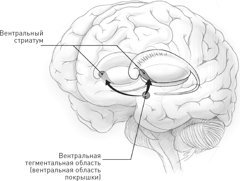 Рис. 14. Дофаминовая связь вентральной тегментальной области и вентрального стриатума. По этому пути проходит подкрепление мотивации и обучение.