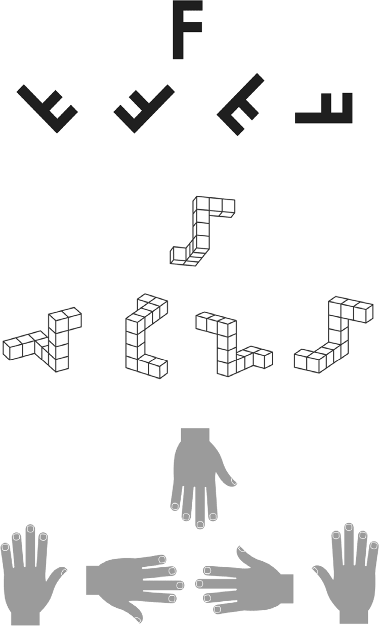 Область познавательных способностей, которая на первый взгляд у мужчин развита куда лучше, – это навык умственного вращения, часть пространственного мышления. На рис. 4 показан стандартный тест: несколько объемных изображений предметов, причем у каждого есть идентичная пара, то есть точно такой же предмет, изображенный под другим углом. Выбрать нужно среди похожих предметов, например почти таких же, но нарисованных в зеркальном отображении.