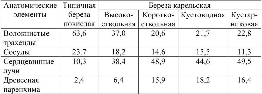 Таблица 2 – Соотношение анатомических элементов в древесине березы карельской, проц.