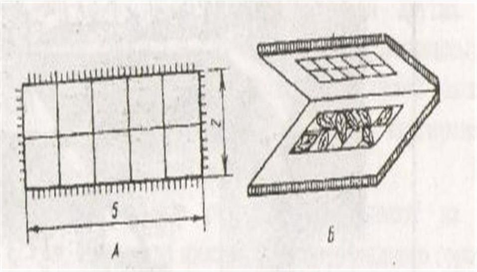 Методы оценки проективного покрытия детально разрабатывались Раменским Н.Г. (1937, 1956) для более точного определения проективного покрытия он предложил сеточки и мерные вилочки (см. рисунок 2). Передвигаясь с одного места на другое и держа сеточку перед собой, наблюдатель мысленно концентрирует проекции растений и подсчитывает, какое число ячеек занято проекциями, проективное покрытие выражают в процентах. Сеточки позволяют учитывать снизу вверх проекции крон деревьев. Мерные вилочки осторожно заводят в травостой в горизонтальном положении. Они позволяют оценить площадь проекции отдельных растений, поскольку площадь, заключенная между отдельными зубцами, соответствует долям процента или процентам общей площади пробы.
