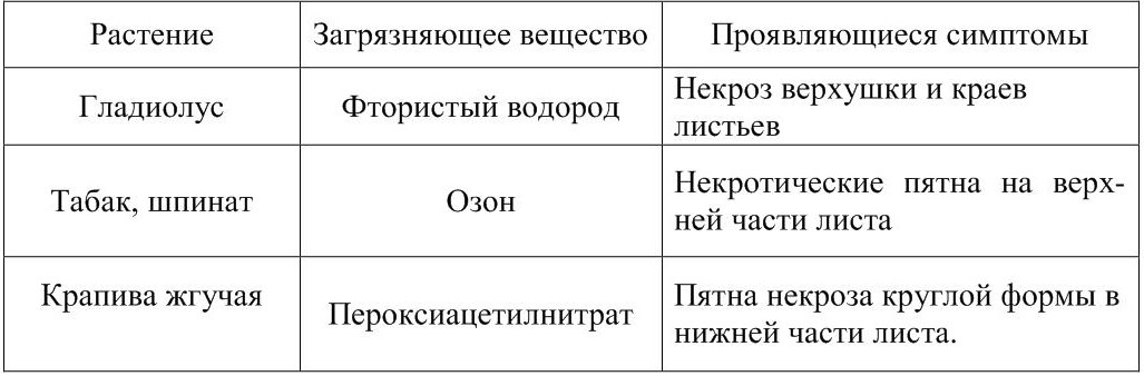 Довольно много видов растений можно использовать в качестве индикаторов или накопителей загрязнения воздуха из-за их способности давать визуально заметные реакции (таблица 3).