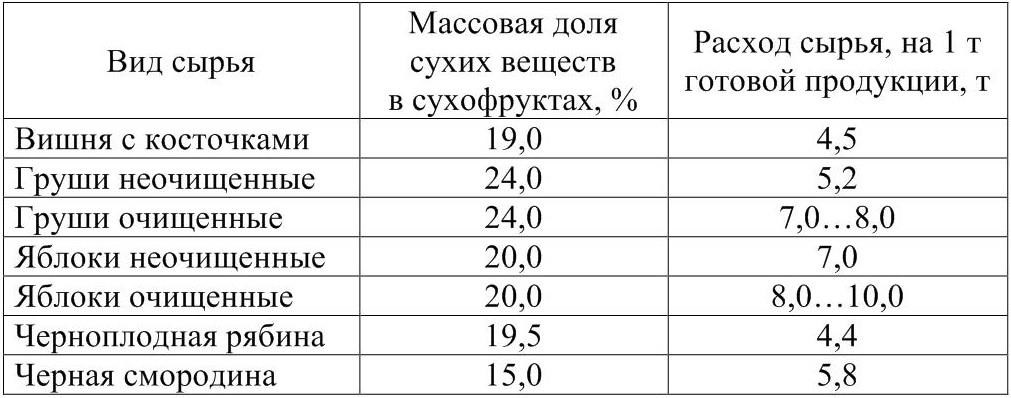 Расход сырья для получения 1 т сушёных фруктов зависит от вида плодов и готовой продукции, от массовой доли сухих веществ в сырье и сушёном продукте, отходов и потерь при сортировке, мойке, резке, сушке и т. п. (таблица 3).