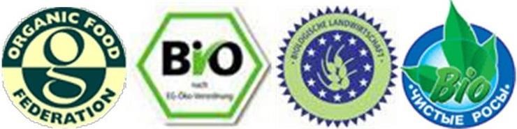 Знаки, присваиваемые продукции Органик / Био (на основе Европейского законодательства) (рисунок 2), выращенной на биологически контролируемых территориях без применения удобрений, пестицидов, гормонов роста. Три первых – европейские знаки, последний – знак отечественного происхождения.