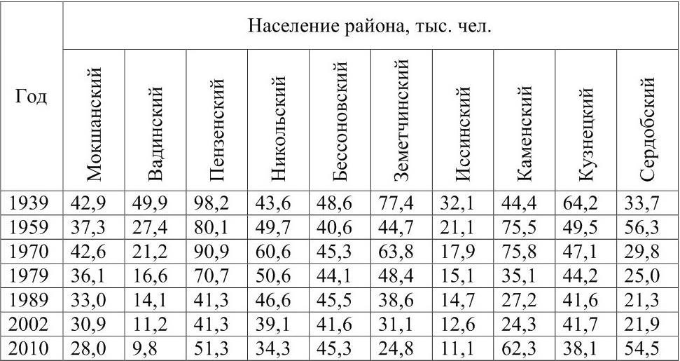 Таблица 5 – Общая численность населения районов Пензенской области с 1939 по 2010 гг.