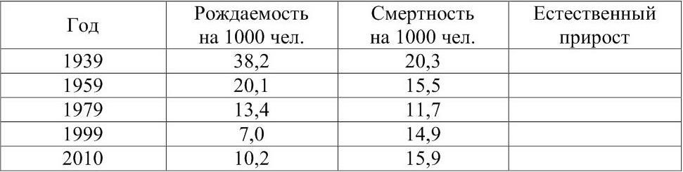 Задание 4. Рассчитайте естественный прирост населения Пензенской области с 1939 по 2010 годы, используя данные. Объясните какие, по вашему мнению, факторы влияли на демографическую ситуацию в области в этот период. За счет чего произошел рост численности населения в 2010 году?