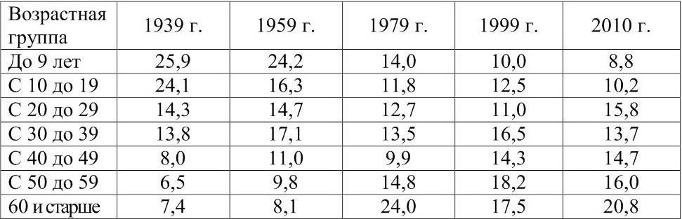 Задание 5. Проанализируйте возрастную структуру населения Пензенской области, используя данные таблицы 6. Постройте диаграмму и сделайте вывод. Чем можно объяснить процесс «старения» населения? Какой характер – растущий, стабильный или сокращающийся имело население Пензенской области с 1939 по 2010 гг.?