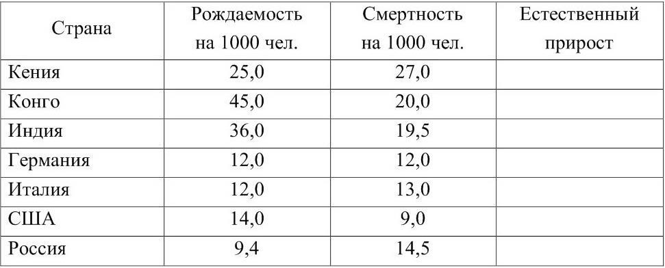 Задание 7. Рассчитайте естественный прирост населения в различных странах мира, используя данные таблицы 7. Проанализируйте их и сделайте вывод, за счет населения каких стран происходит рост численности Земного шара. Перечислите возможные причины неблагоприятной демографической ситуации в России.
