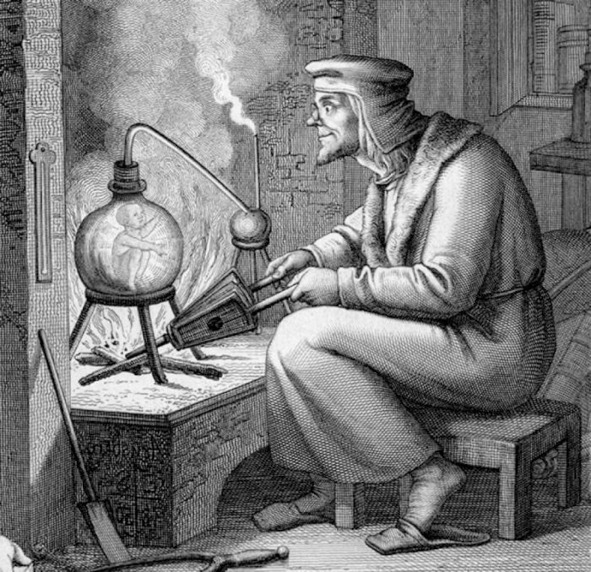 Можно понять достойное уважения стремление средневековых алхимиков создать человеческое существо в «пробирке» смешением разных материальных субстанций. Образ «гомункулуса» – модели маленького живого человечка, будоражил умы ученых мужей, сделавших методом «проб и ошибок» много научных открытий в области химии. Опыты по сотворению гомункулуса имели характер поисков ответа на вопрос о происхождении человека естественным путем. На рисунке видим удивление и несказанную радость экспериментатора, наконец-то получившего вожделенное изделие, приветствующее своего отца-создателя ручками и радостной улыбкой.
