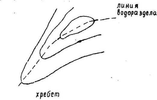 Линия водораздела проводится перпендикулярно к горизонталям. Нужно учитывать, что в самых высоких местах хребтов и вершин линия водораздела делит пополам пространство, заключенное между замкнутой горизонталью, если не указана отметка вершины.