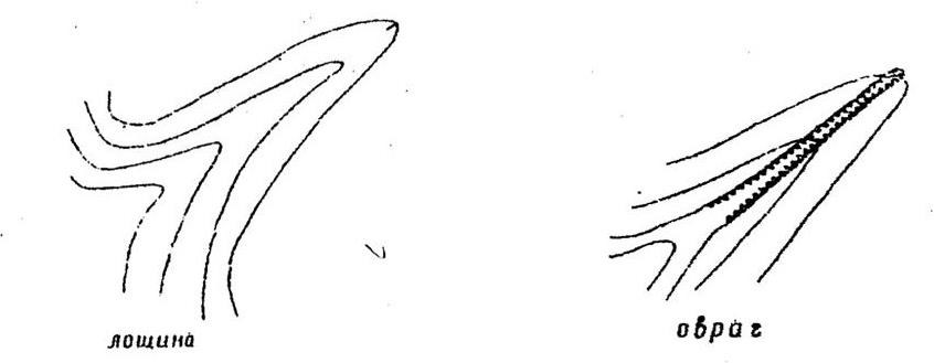 На рисунке 6 изображена лощина. Лощина и долина изображаются незамкнутыми горизонталями с бергштрихом, направленным внутрь. Овраг изображается зубчиками (коричневого цвета).