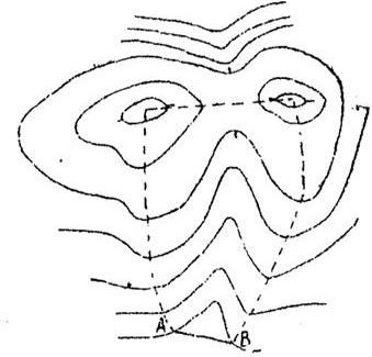 Ознакомившись с изображением основных форм рельефа горизонталями, студент должен найти на карте по отметкам самые высокие и самые низкие места, а также указанные основные формы рельефа: холм или гору, котловину, лощину, хребет и седловину. Далее для створа, намеченного преподавателем, провести водораздельную линию, ограничив площадь водосбора данной лощины или водостока (на рисунке 8 створ линии АВ).