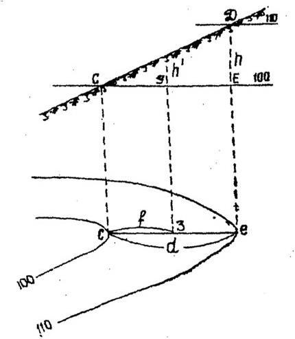 В начале следует определить отметки всех горизонталей, пересекаемых линий АВ, и характерных точек, лежащих между горизонталями. На рисунке 9 характерной является точка 3, которая лежит на дне лощины между горизонталями с отметками 100 м и 110 м. Определим отметку этой точки 3 (рисунок 9). Заложение горизонталей d (расстояние между горизонталями на карте) по линии СЕ, допустим, равно 36 мм, а расстояние f от точки С до точки 3 равно 18 мм.