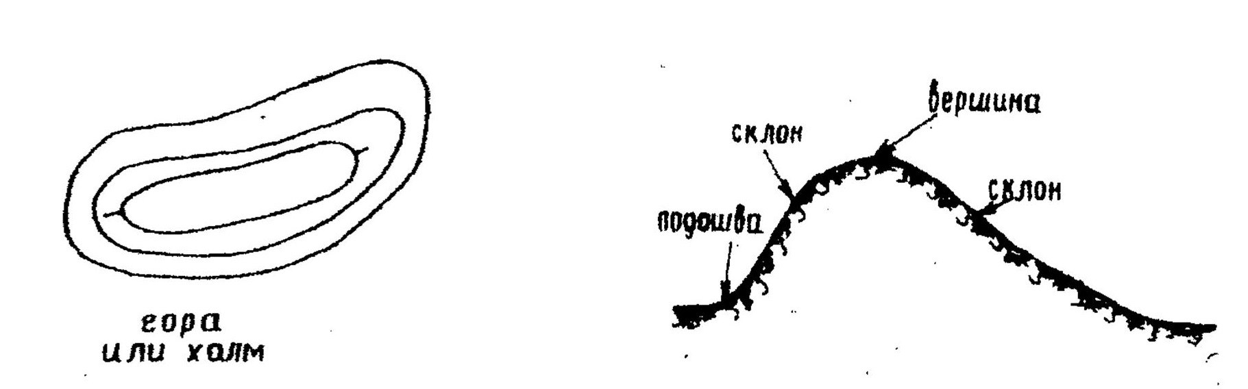 Отдельное возвышение над окружающей местностью в виде купола или конуса высотой до 200 м называется холмом, а при высоте более 200 м – горой. Самая высокая часть горы или холма называется вершиной, от вершины идут склоны, низ склона называется подошвой. Замкнутые горизонтали с бергштрихом, направленным наружу от горизонтали к подошве, изображают гору или холм (рисунок 3).