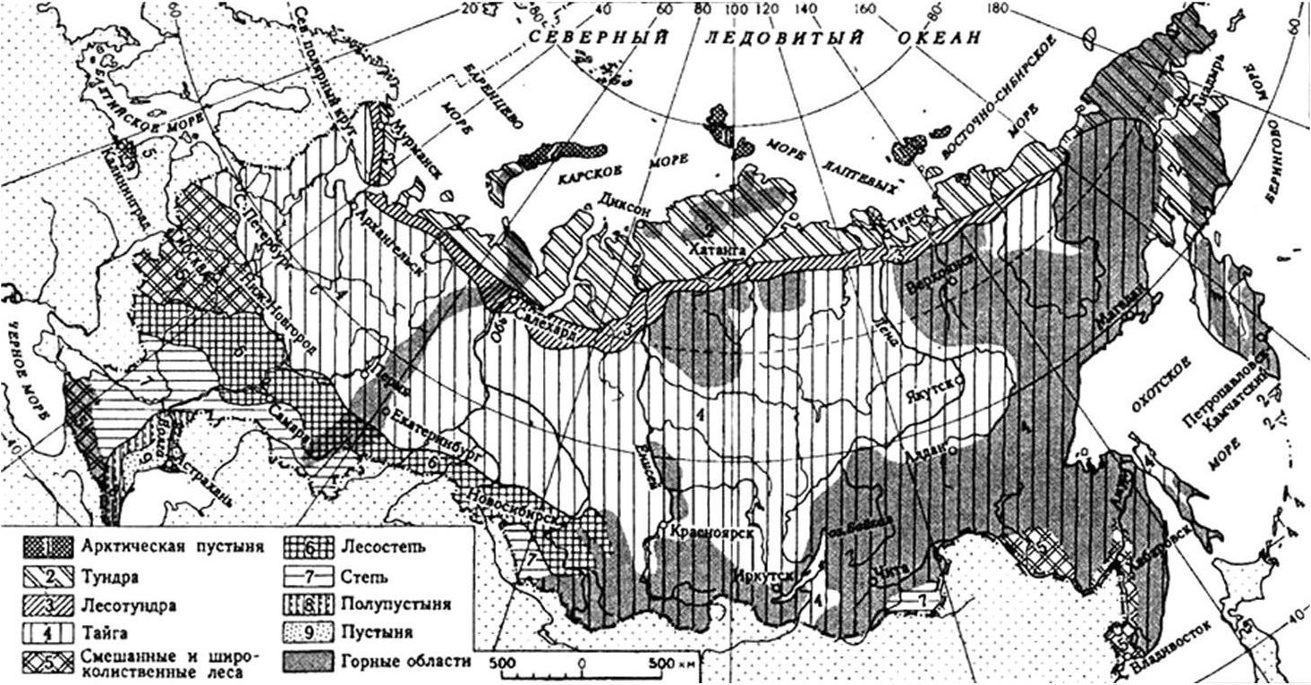 Тундра – безлесная зона с низким и не всегда сплошным растительным покровом. Основу его образуют мхи и лишайники, на фоне которых развиваются низкорослые цветковые растения – травы, кустарнички и кустарники. У тундровых растений корневая система развивается в пределах небольшого деятельного слоя. Растения невысоко поднимаются над землей, часто имеют подушкообразные и стелющиеся формы. Кустарники – карликовая березка и ивы – нередко возвышаются над снегом, поэтому страдают от механических повреждений от переносимого ветром снега. В местах скопления снега растения лучше переносят суровую зиму, поэтому их состав здесь более разнообразен, но медленное таяние снега задерживает вегетацию. Неблагоприятные условия произрастания определяют малую продуктивность биомассы, но господство в составе растений многолетников обусловливает довольно значительные ее запасы – от 40 до 280 ц/га.