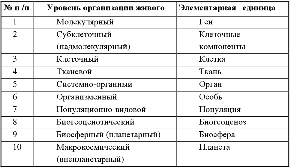 К 60-м годам XX века в биологической науке сложилось представление о структурности живой материи. Живое на нашей планете представлено в виде отдельных дискретных единиц, т.е. организмов, особей. Каждый живой организм, с одной стороны, состоит из единиц, подчиненных ему уровней организации, а с другой – сам является единицей, входящей в состав надорганизменных биологических макросистем (популяции, биогеоценозы, биосфера в целом). Существование жизни на всех уровнях подготавливается и определяется структурой низшего уровня. Отмечается большое сходство дискретны единиц на низших уровнях и все возрастающее различие на высших уровнях. На каждом уровне можно выделить элементарную единицу, т.е. структуру, изменения которой составляют на соответствующем уровне содержание эволюционного процесса.