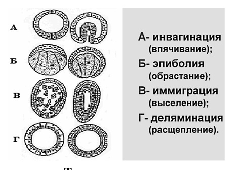 1. Инвагинация (впячивание) – происходит впячивание внутрь бастоцеля целого участка клеточного пласта, не утратившего эпителиальной структуры. Образуется двухслойный мешок, наружной стенкой которого является первичная энтодерма, а внутренний слой образует энтодерму. Впячивание формирует гастроцель (первичный кишечник), а ведущее в нее отверстие – бластопору (первичный рот).