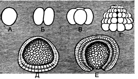 В- стадия 4-х бластомеров; Г- морула; Д- бластула; Е- гаструла.