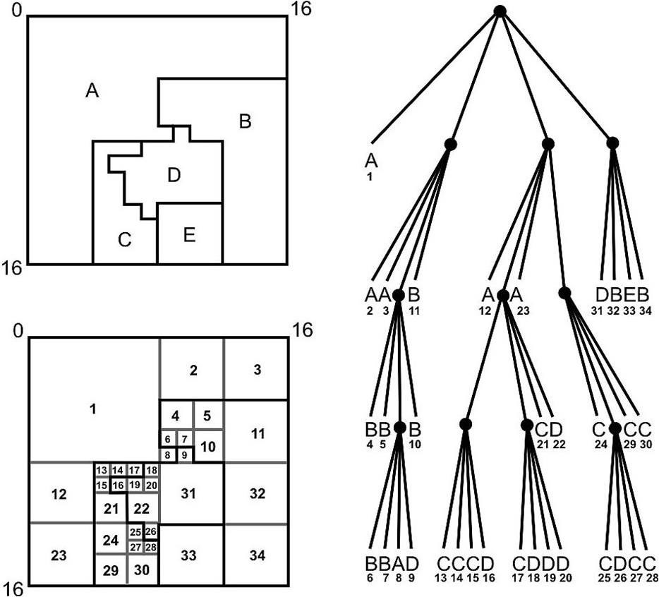 Экономия в сравнении с растровой моделью данных очевидна – область Е на рис. 8. оказалась представленной одним квадратом под номером 33 (а не 16 элементами растра или ячеек регулярной сети), и ее цифровое описание подразумевает лишь формализованное представление структуры квадродерева.
