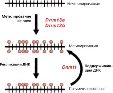 Отрезок геномной ДНК показан как линия с самокомплементарными парами CpG, маркированными как вертикальные штрихи. Неметилированная ДНК (верхняя часть рисунка) становится метилированной “de novo” благодаря Dnmt3a и Dnmt3b и дает в результате симметричное метилирование в определенных парах CpG. После полуконсервативной репликации ДНК дочерняя нить ДНК спарена основаниями с одной из метилированных родительских нитей (другой продукт репликации не показан). Симметрия восстанавливается поддерживающей ДНК-метилтрансферазой Dnmtl, которая завершает метилирование полуметилированных сайтов, но не метилирует немодифицированные CpG