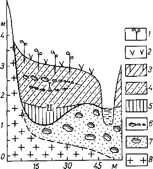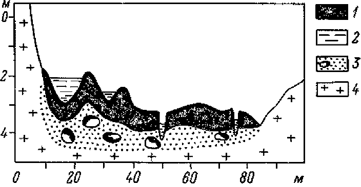 Рис. 97. Поперечный профиль болота Чекового (на западе Кавказа). 1 — торф, 2 — болотные озерки, 3 — морена, 4 — скальный грунт.