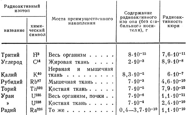 Таблица 6. Содержание естественно радиоактивных изотопов в теле человека (средние значения для человека весом в 70 кг)