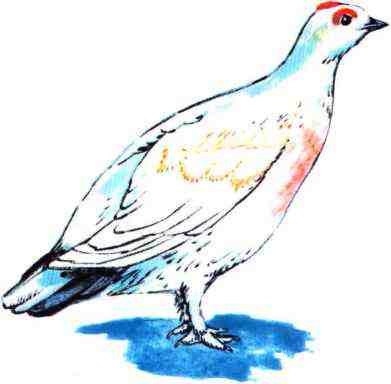 К семейству тетеревиных принадлежит и белая куропатка. Слово «белая» в названии этой птицы не очень точно, поскольку она белая только зимой, а летом приобретает ржаво-бурый цвет с черными пятнами, и многие ее перья имеют только белую кайму. Когда летнее оперение меняется на зимнее, надбровный гребень куропатки начинает вздуваться и краснеть. Оперены у куропатки и ноги. Длина этой птицы — до 40 см. С приходом весны белое оперение заменяется на летнее. Обитает куропатка в северных областях вплоть до самого побережья Ледовитого океана.