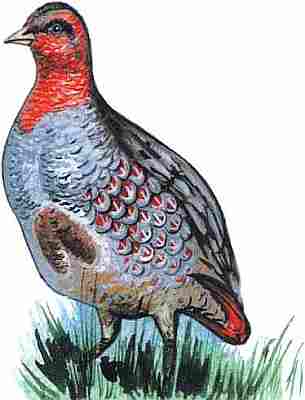 У серой куропатки, принадлежащей к семейству фазановых, множество других названий — полевой, польский, степной, слободский рябчик. Самцы имеют длину около 25 см (самки еще меньше). Живут куропатки на большой территории от Приполярья до Северного Кавказа. Куропатки, обитающие на севере, ежегодно зимой перебираются в более теплые края. Куропатки образуют крепкие семьи, заботящиеся о потомстве. Гнездо представляет собой ямку среди кустарника, выложенную мягкой травой. Выводок кормит и обучает мать, но в случае ее гибели эти обязанности берет на себя самец. Питаются куропатки насекомыми и злаками.
