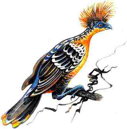 Семейство гоацинов населяет берега Амазонки. Эта птица стоит настолько особняком, что ее нередко выделяют в отдельный отряд. Но большинство ученых сходится в том, что она входит в семейство гоациновых, принадлежащее отряду куриных. Размером гоацины приблизительно с ворону, на голове у них — хохолок, лапы и клюв сильные. Питается гоацин грубой пищей — жесткими листьями тропических растений. Для лучшего усвоения этой пропитанной каучуком пищи у гоацина переваривание начинается уже в зобу. Селятся гоацины колониями по 10–15 пар.