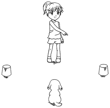 Может быть, Орео просто ассоциировал мой жест с пищей и выбирал ту чашку, которая оказывалась ближе к вытянутому пальцу? Я поставил три чашки перед ним, а еще три — за ним, и указал на одну из чашек, которые были у него за спиной. Орео повернулся и правильно выбрал чашку, хотя она располагалась дальше от моего пальца, чем чашки, стоявшие перед ним.