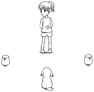 Возможно, реакция Орео была чисто рефлекторной, и он всего лишь реагировал на мое движение, а не на конкретный жест. Так, если я выставляю какую-то часть тела в сторону, Орео следит за ней — и все. В таком случае это означало бы, что собака подходит к выбранной чашке, но не понимает, что я ей подсказываю. Но Орео следовал указательному жесту и в тех случаях, когда я направлял палец влево, в тот же момент делая шаг вправо. То есть, даже видя, что я отхожу от нужной чашки к пустой, он шел в противоположную сторону, следуя моей подсказке.