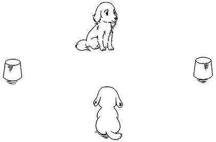 Но еще интереснее тот факт, что уже в полуторамесячном возрасте щенята легко проходят описанный выше тест с кубиком. Если щенок видит, как человек кладет кубик на чашку, то он выбирает именно эту чашку — точно как взрослая собака. Щенки вполне понимают указательный жест и в тех случаях, когда человек стоит в метре от чашки и даже дальше либо если щенку требуется отойти от человека, чтобы приблизиться к нужной чашке. Последний факт исключает возможность того, что щенки выбирают нужную чашку лишь потому, что их привлекает человеческая рука.