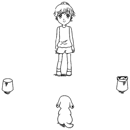 Я стою и указываю на ту чашку, под которой спрятана пища. Девочка на рисунке — это приглашенный специалист, она нисколько не напоминает меня в 1995 году.