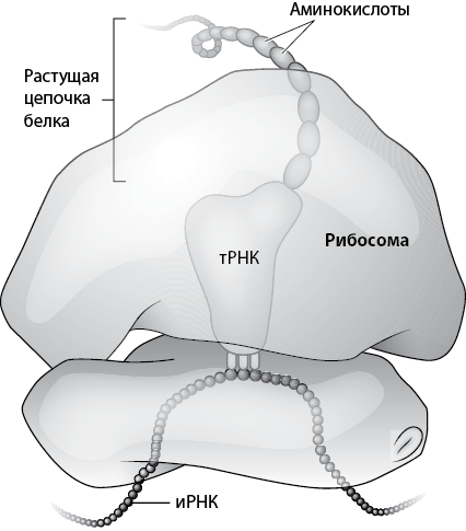Два основных комплекса, составляющих рибосому, взаимодействуют приблизительно так же, как работает пара рычагов. Аминокислоты переносятся к рибосоме третьей молекулой РНК – транспортной РНК. По мере того как информационная РНК скармливается рибосоме наподобие макаронины, два этих белковых комплекса движутся взад и вперед, прикрепляя одну за другой необходимые аминокислоты, чтобы собрать молекулу белка. Таким образом эта белковая фабрика «штампует» информацию, заключенную в генах. Этот замысловатый механизм работает с невероятной скоростью – за секунду к формирующейся белковой цепочке добавляются от десяти до двадцати аминокислот.