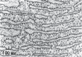Рис. 12. Электронная микрофотография, показывающая распределение рибосом (маленькие ворсистые шарики) вдоль системы мембран (эндоплазматическая сеть) в эукариотической клетке. На подобном изображении Джордж Паладе впервые идентифицировал рибосомы, чтобы впоследствии их изолировать